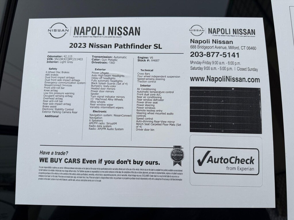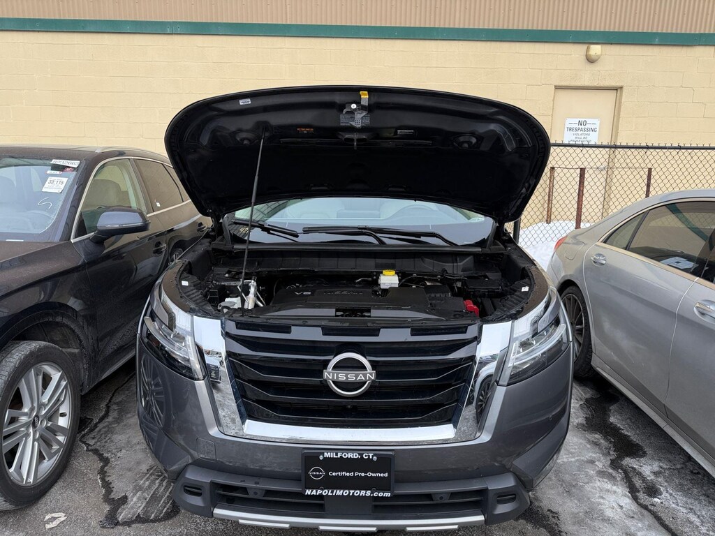 4WD. Recent Arrival! Certified. Gun Metallic 2023 Nissan Pathfinder Automatic V6 4WDSLIf your car doesn't say Napoli on it, you paid too much!Nissan Certified Details: * Limited Warranty: 84 Month/100,000 Mile (whichever occurs first) * Vehicle History * Warranty Deductible: $100 * 167 Point Inspection * Roadside Assistance * 7 Year/100,000 Mile Limited Warranty, 24/7 Hour Roadside Assistance, Carfax Vehicle History Report, Plus 1 Year Pre-Paid Maintenance Included. Gas Powered Nissan Models Only. * Transferable WarrantyAND REMEMBER !! IF YOUR CAR DOES NOT SAY NAPOLI ON IT YOU PAID TOO MUCH !!!!